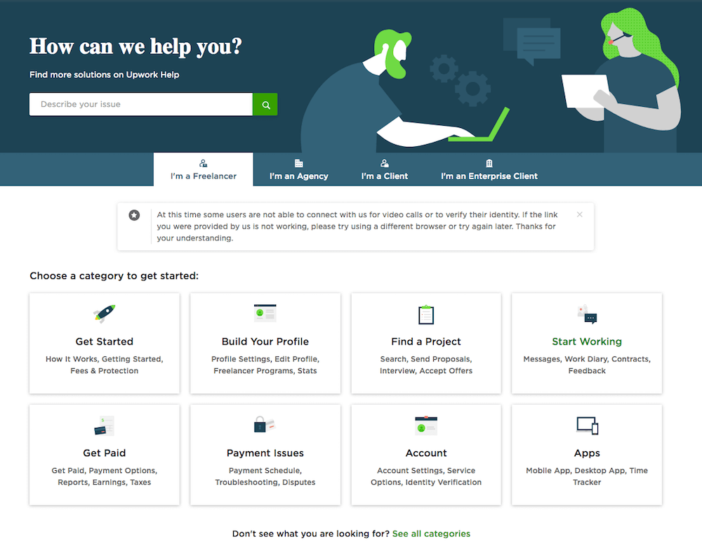 Upwork has an extensive FAQ section on their website, along with blog posts that can help answer any question from their payment system to how to craft winning proposals. If neither of these options work for you, they have 24/7 chat support and their agents are always incredibly helpful and patient — even when the user is an ape with opposable thumbs like me!