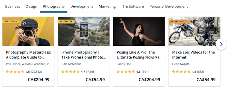 Courses are split up based on their category. You have the option to search for what you want to learn, but there are also individual pages for each category. This is perfect for the learner who isn’t sure what courses to take but have a general idea of what they want to learn. Udemy’s featured categories are business, design, photography, development, marketing, IT & software, and personal development. Options from each featured category are available for easy browsing on the website’s homepage. You can easily find more categories in the drop-down menu.