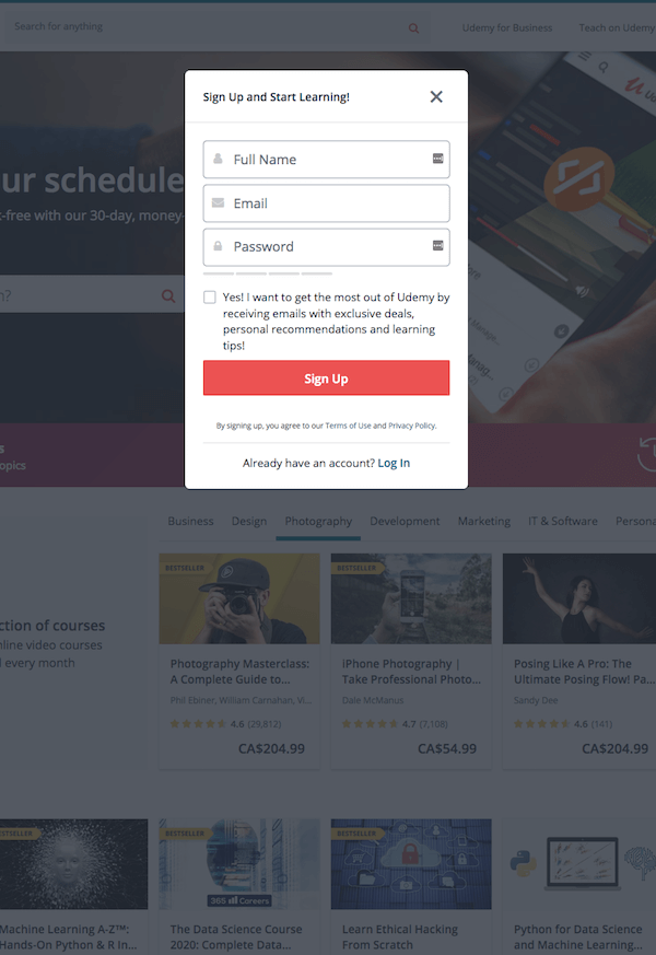 Signing up on Udemy is a quick process. You just need to input your name, email, and a password. This will allow you to save courses, get promotion codes, and enrol in classes. Once you’ve signed up and added at least one course to your cart for purchase, you’re able to start learning. Setting up for individual courses will have a few differences from each course. Each course description will include whether you need any additional materials or not. For many courses, you’ll need little more than a pen and paper. However, more advanced courses or those that train you in specific areas may require materials such as certain web software.