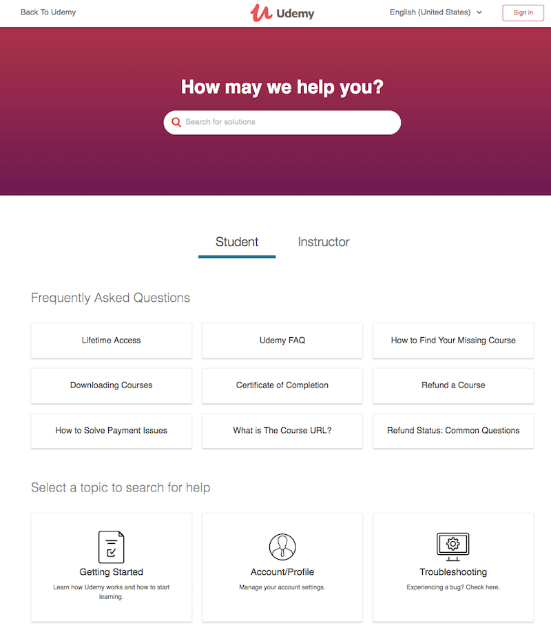 Udemy has an extensive help center with pre-written answers to the most common questions. You can search for a solution or browse through frequently asked questions for both students and instructors. There is also a form to submit a request for help if you need to explain your issues.